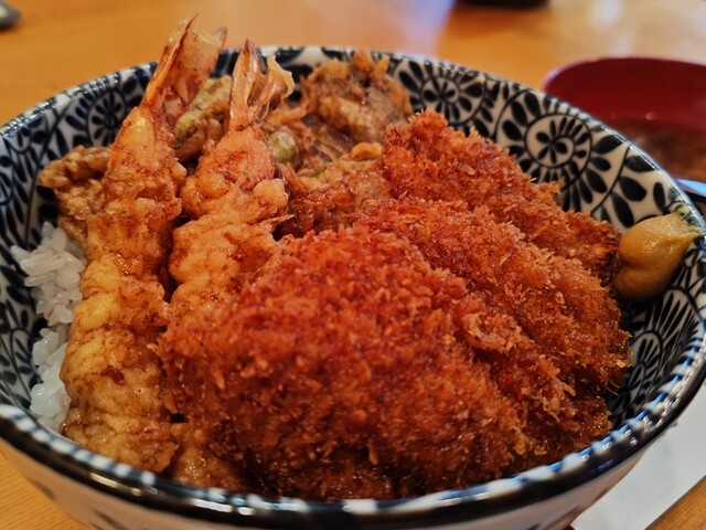 ランチに天カツ丼を頂きました。天丼とカツ丼を迷う人が多いから作ったらしい、ボリューム満点で味も優しく美味しかった。
