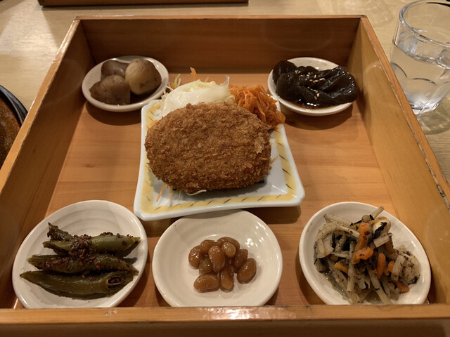 定食だと小鉢5つとコールスローサラダとコロッケが付く、ランチタイムはコーヒーがサービスでつく