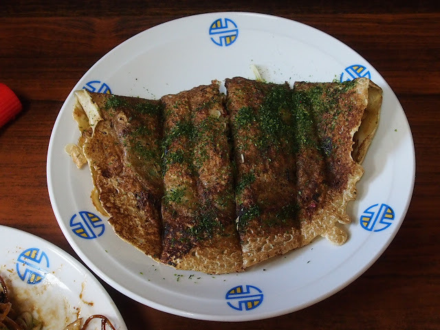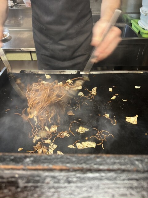 目の前の鉄板で焼きソバとお好み焼きを焼い...