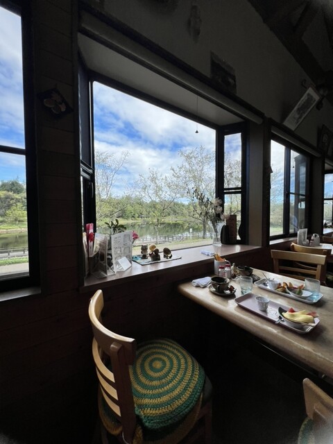 窓からは池が見えます。