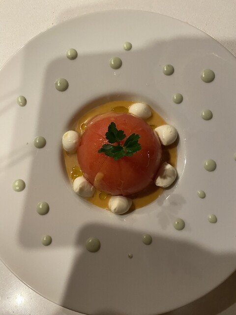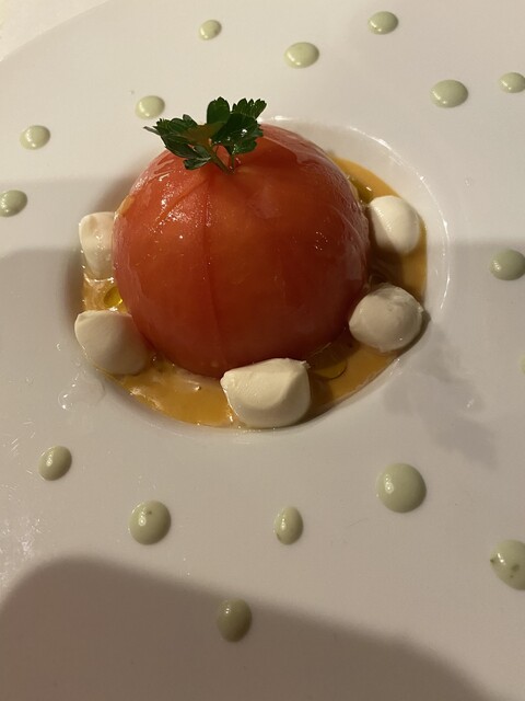 前菜のムース スープ メインのマルゲリータのピザ + ドルチェのセットでジャスト2000円 (今日はポイント利用で100円のお支払いのみ)