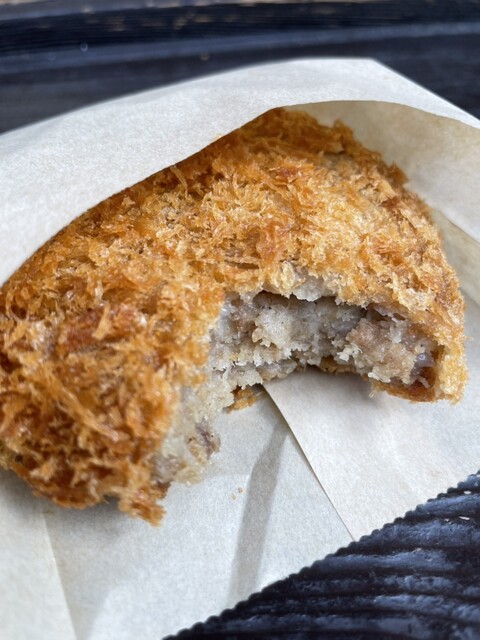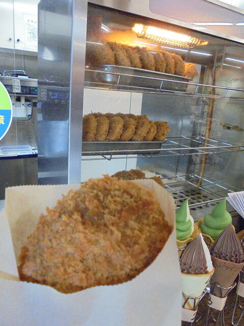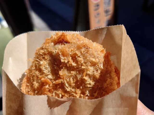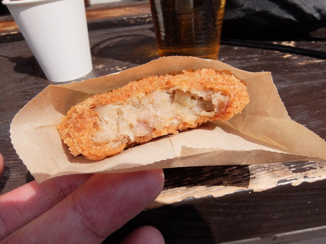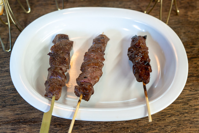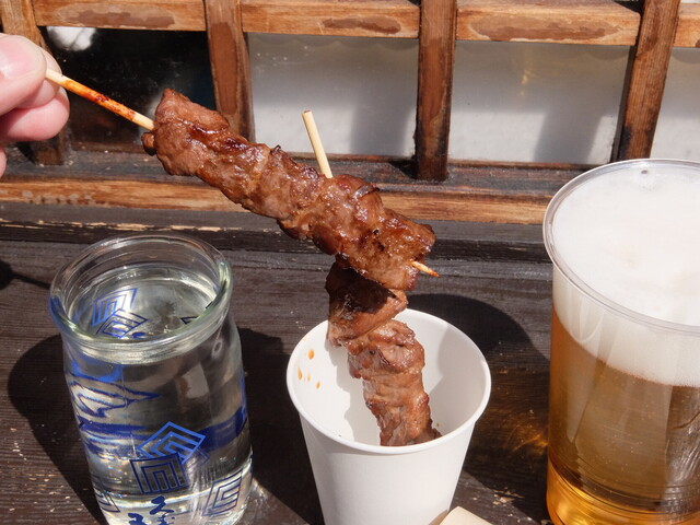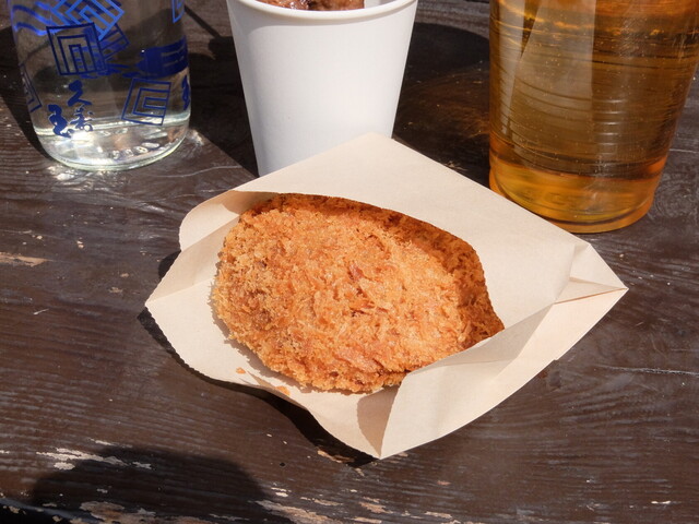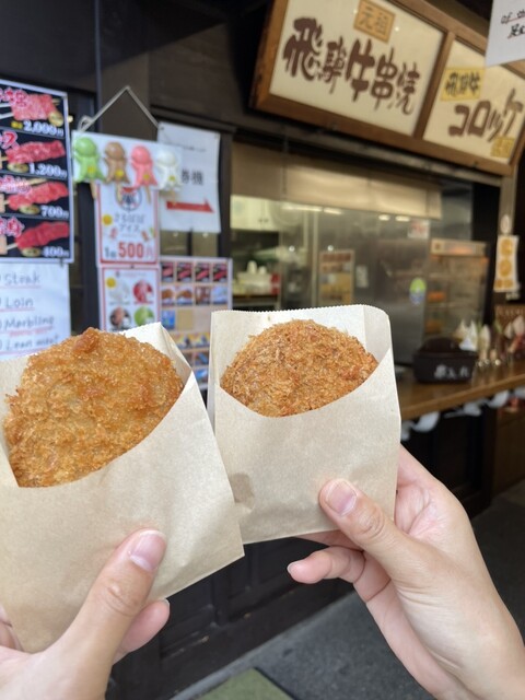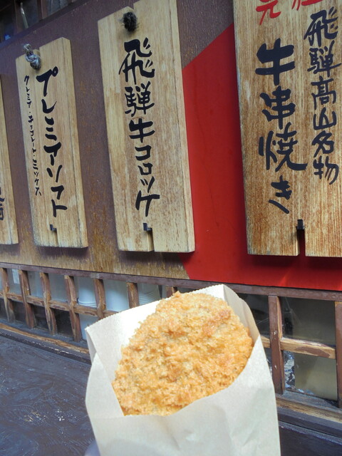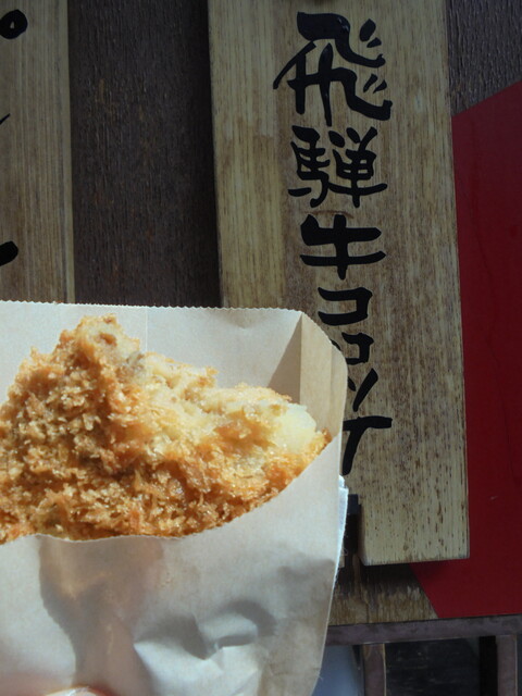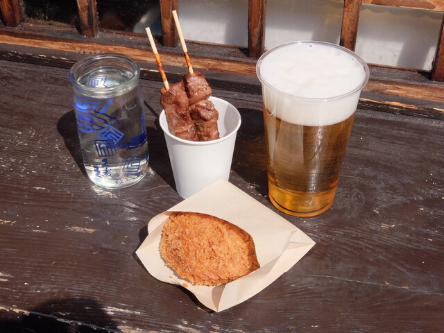 今回は、飛騨牛の串焼き、コロッケ、それにお酒を頂きました。