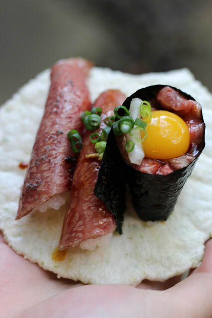 コチラは~通り沿いのテイクアウトカウンターで肉寿司を買い求め!? 店内でも頂けるシステム!!