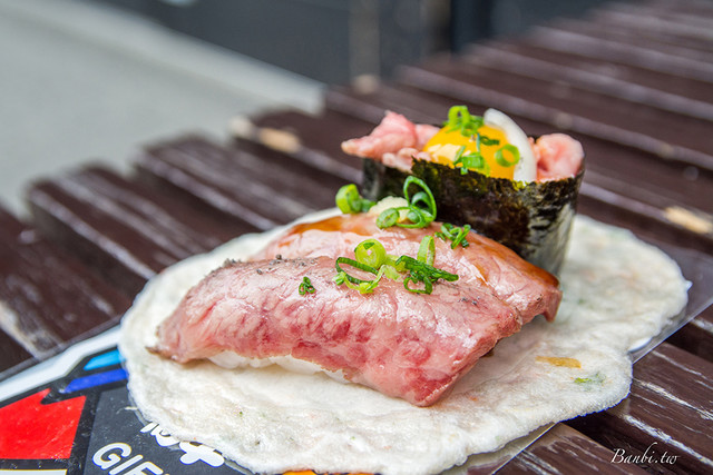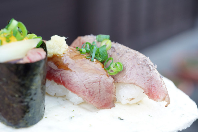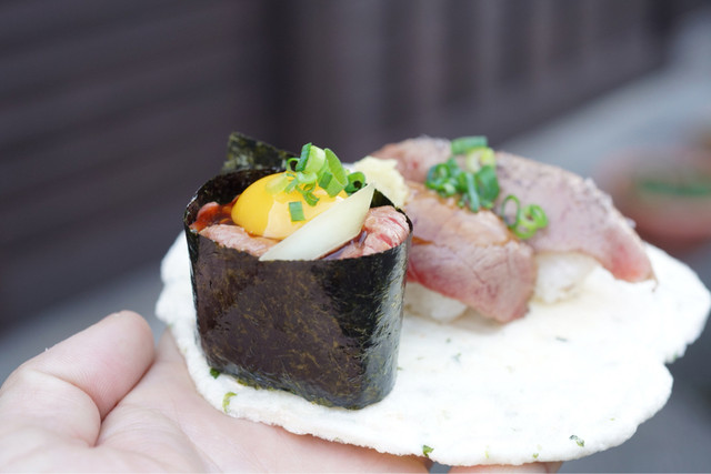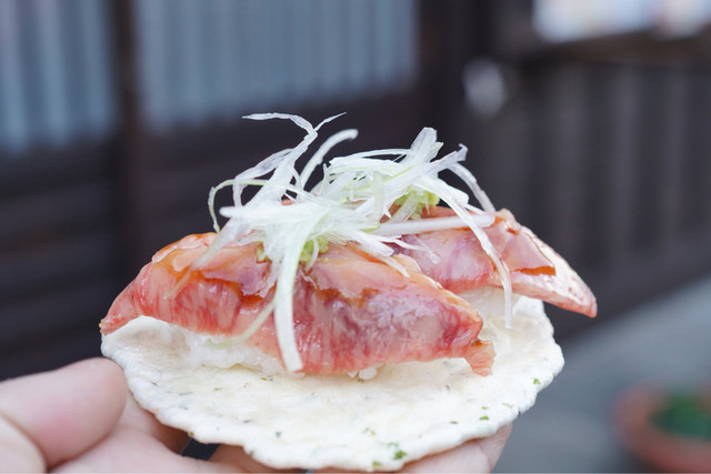 そういえば~高山古い町並み方面で忘れてはならない!? コチラの肉寿司!! ヾ(๑⃙⃘´ꇴ`๑⃙⃘)ノ高山牛を気軽に食べれるやんか〜♪