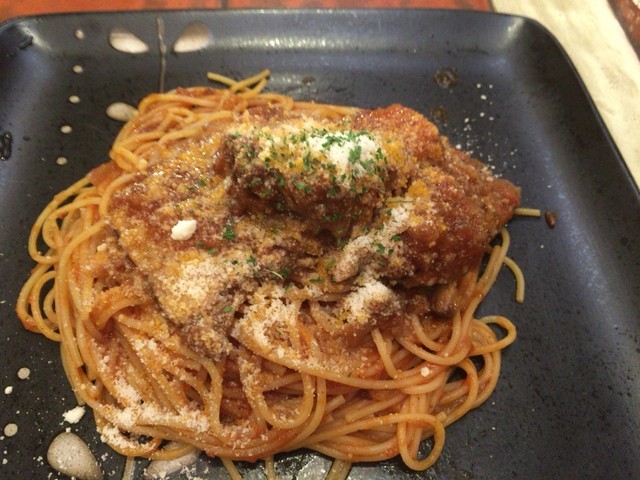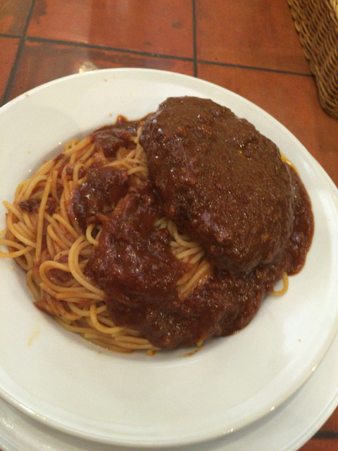 スパゲティハンバーグのソースはミートソース。カッチャジョーネのベースに使っているミートソースと同じだと思います。甘口で口当たりの良いミートソース。お子様向けの味付けで子供は大喜びでした。