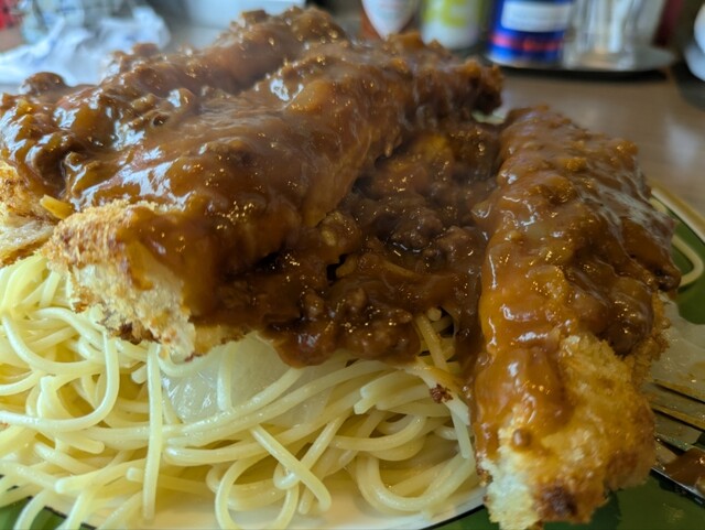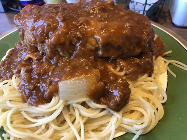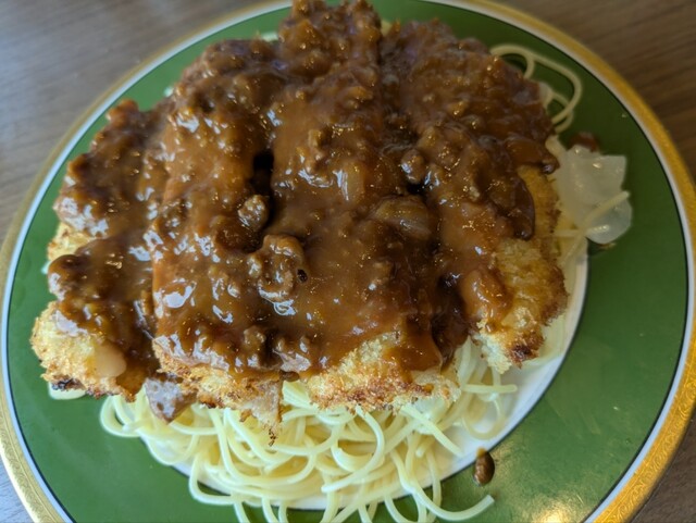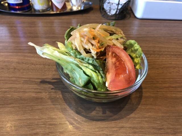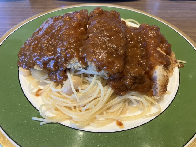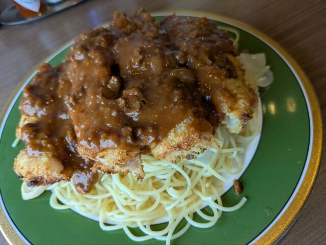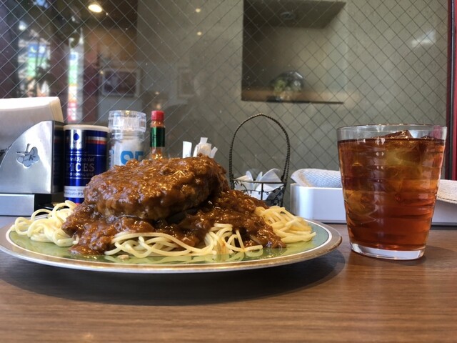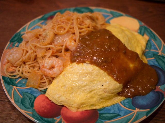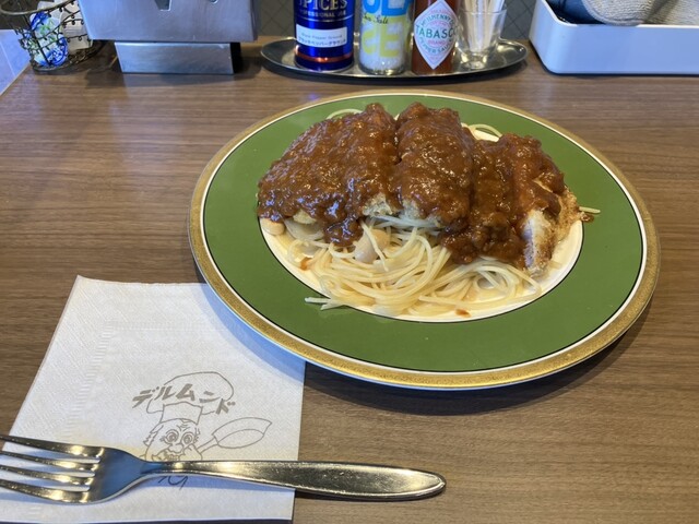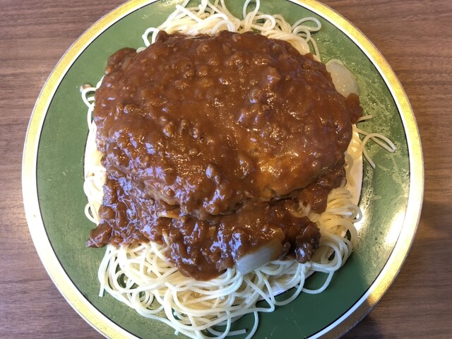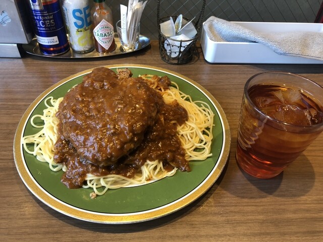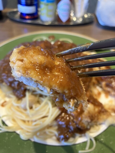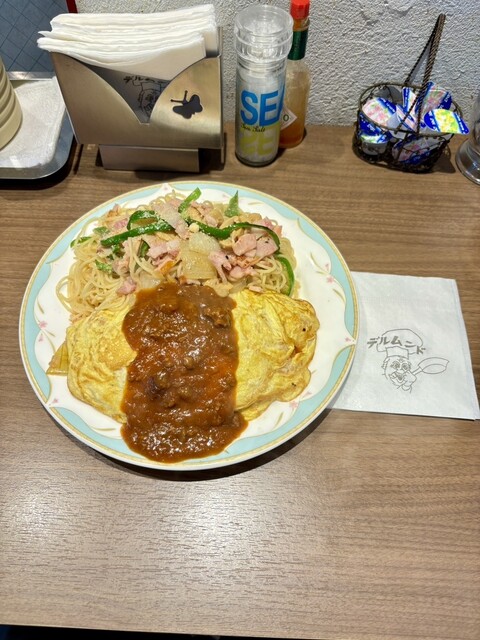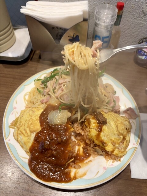 何回か来ましたが、昼の部で売り切れが多く午後営業はほとんどされていない様で今日はお昼におじゃましました。写真にある様に1階の階段登り口のところに売り切れのお知らせの貼紙があると、午後営業はされていないようです。過去3回来店してやっとピットイン。本日はお昼ですがディナーメニューのスパゲッティ(ペペロンチーノ)&オムライスセット1,600円を頂きました。昼でもディナーメニューオッケーだそうです。男性も...
