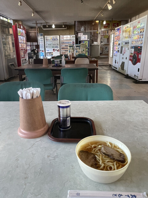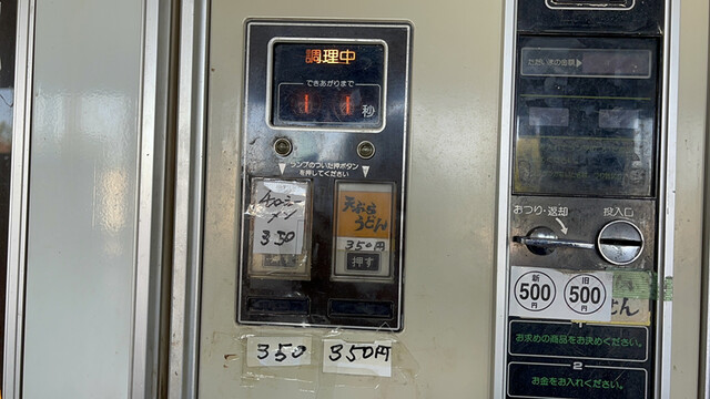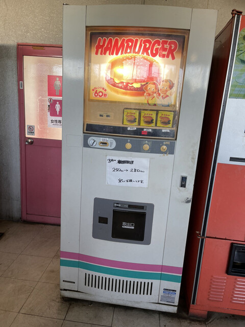 自販機コーナーに移動すると、うどん、そば、ラーメン、トーストサンド、ハンバーガー、瓶ジュースと夢のようなラインナップ。