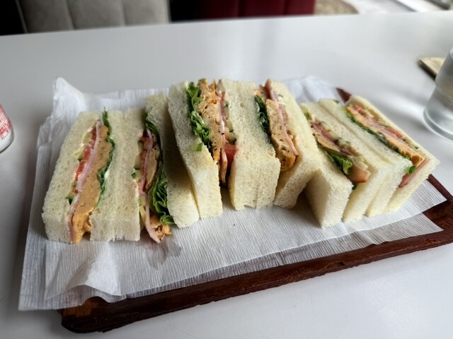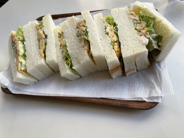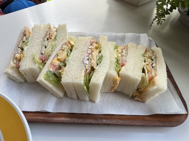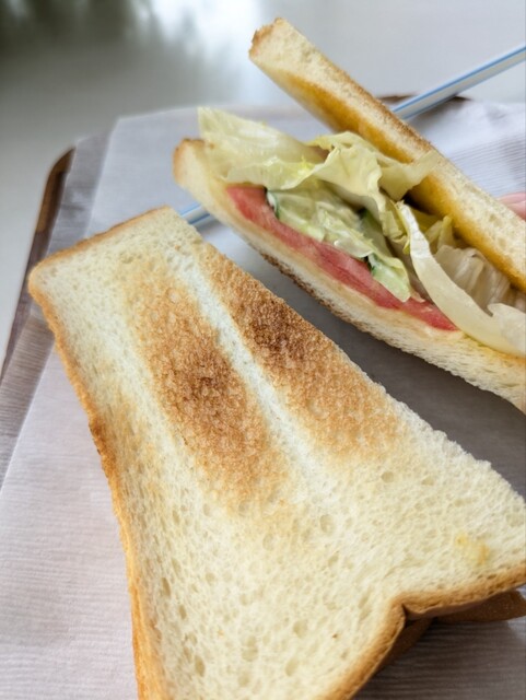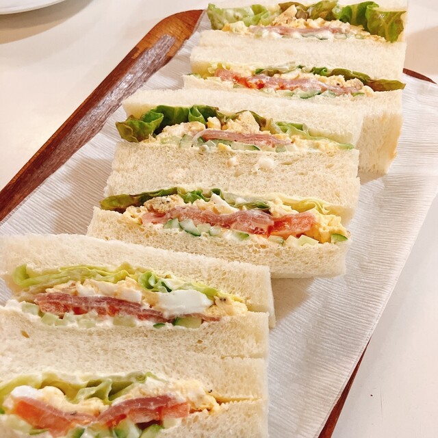 パンの耳が落とされたタイプのサンドイッチ。具材はレタス、トマト、きゅうりのみのサンドイッチです!...