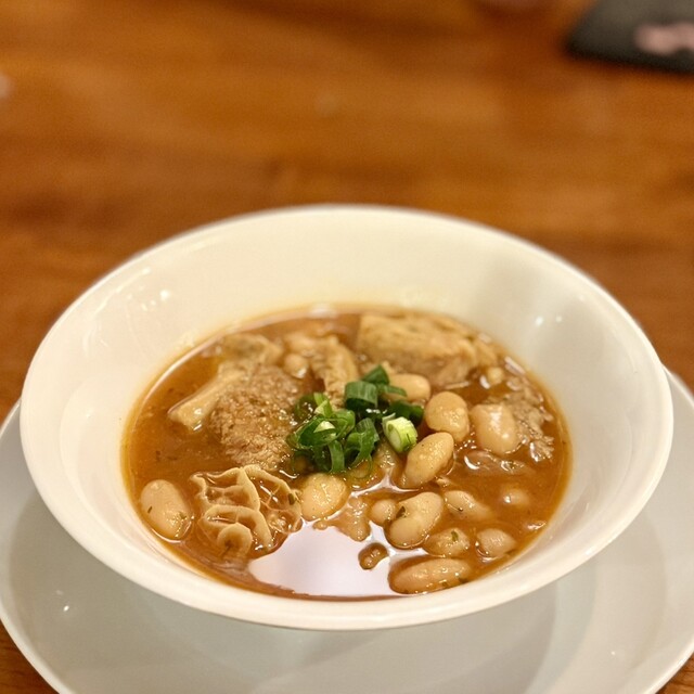サイドメニューのブラジル風モツ煮は優しいお味。付け合わせのソテーはケール。青...