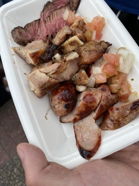 程なくして運ばれるお肉は鉄串に刺された正にシュラスコというスタイル。それを手早く切り分けていただき熱いうちに頬張る。肉やソーセージは割としっかりの火入れ。