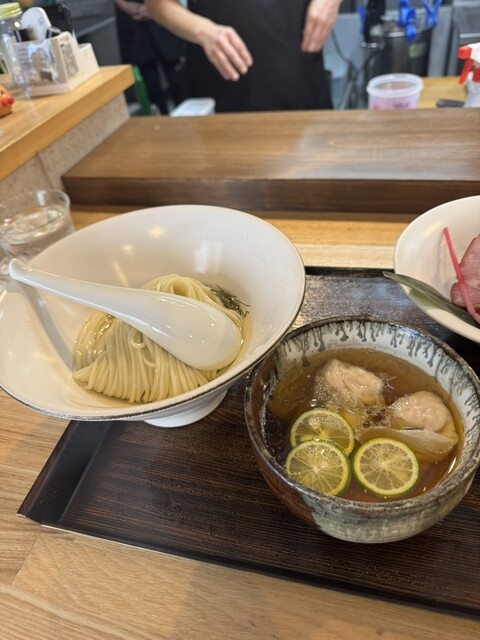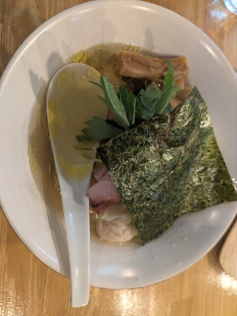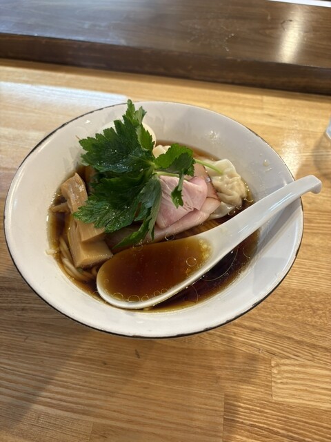 白醤油松。所謂特製的な感じで、チャーシュー、ワンタン、煮卵、焼き海苔と豪華なトッピング。スープは、白醤油なのでスッキリ和な感じ。麺は細平打といった感じのお蕎麦のような角切り麺。これがとても美味しい。接...