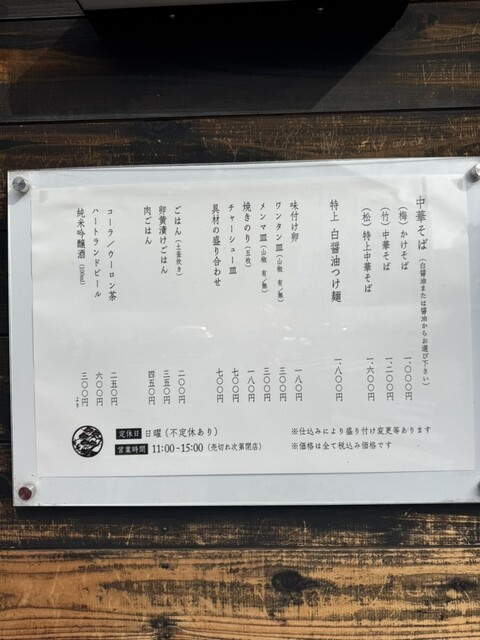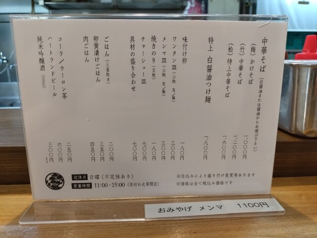 本日は(松)特上中華そば(白醤油)(1600円)+肉ごはん(450円)をオーダー。13時25分提供