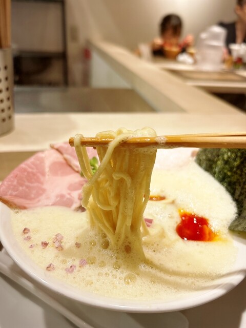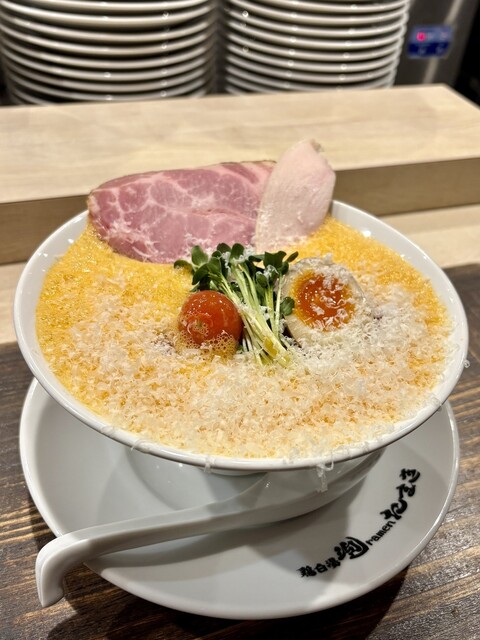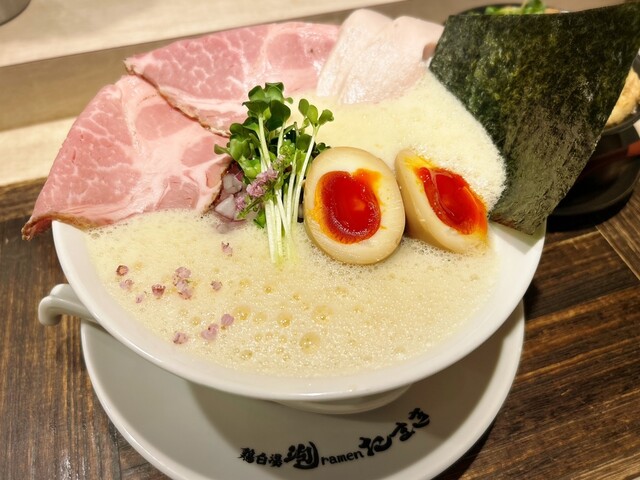 群馬県で気になっていたラーメン屋の一つ。 日曜日の昼過ぎに少し行列があり、日差しが厳しかったのですが、日傘を貸してくれる親切は嬉しかったです。 注文は店一押しの鶏白湯泡ramen醤油と炙り肉親子丼(小)を注文。 先に親子丼が到着。とじた卵に生卵を絡めると全体的にまろやかになり、中の炙った鶏肉の... 詳細を見る