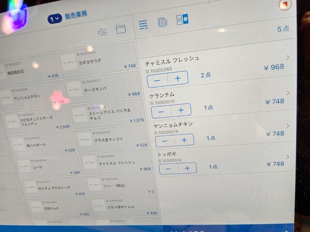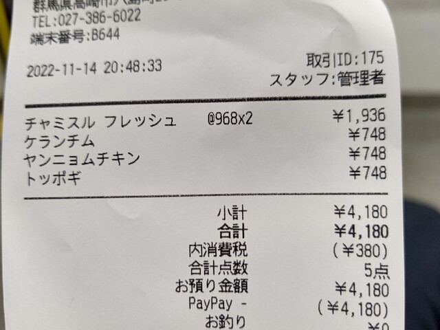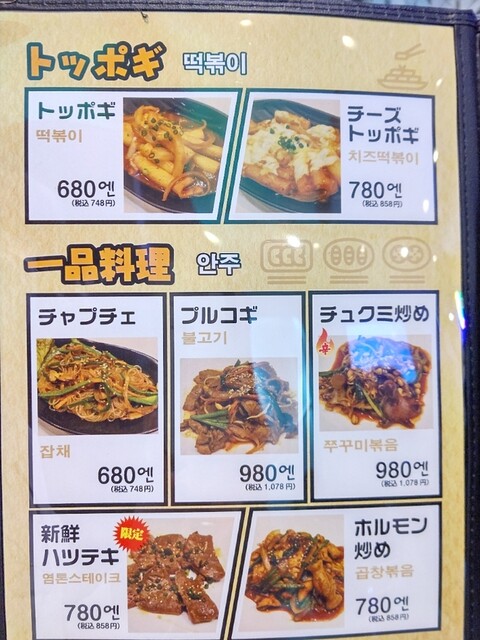 ●追加で「チャミスル(フレッシュ・360ml)968円」と「トッポギ748円」を注文しました。