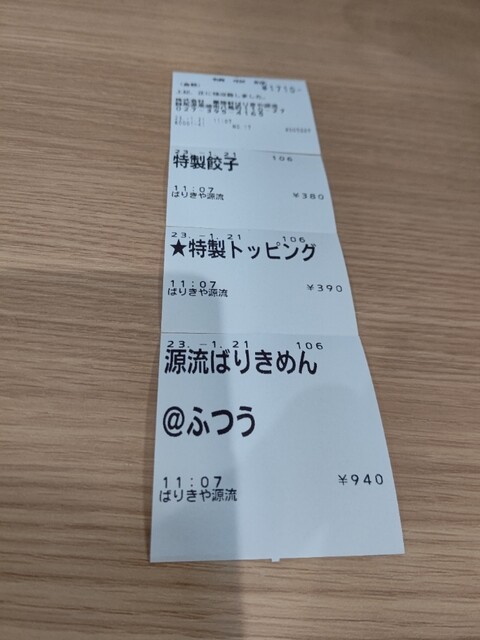 【2023.1.21(土)】源流ばりきめん(並盛・100g)940円+特製トッピング390円+特製餃子380円