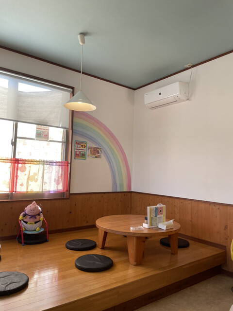 カウンター5席、二人掛けテーブルが3つ、小上がりに4人席が3つという店内レイアウト。壁には少し色あせた虹の絵が描かれており、どこか保育園を思わせるような内装で、子どもにも好まれそうな雰囲気です。