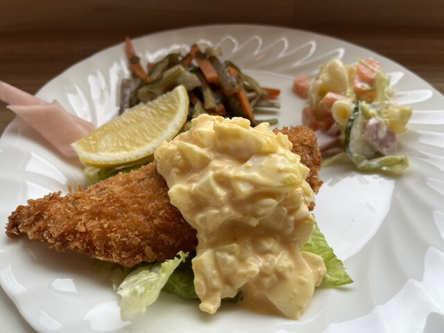 初めての来店になります。日替りランチは、2種類から選べます。この日は、アジフライか豚の味噌焼きからの二択でした。アジフライを選択。アジフライのタルタルソースは、手作り感満載。いい卵を使っているのがすぐ...