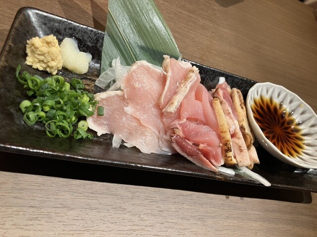 鶏刺し2種盛りはもも肉はコリコリむね肉は柔らかくめっちゃ美味しい✨