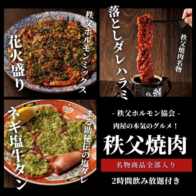 「【5,000円】まる助2代名物"秩父ホルモン花火盛り"と"落としダレハラミ"・2時間飲み放題付き」がおすすめです。