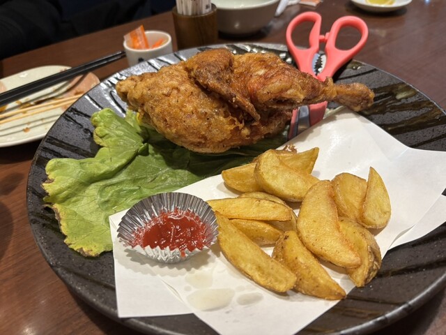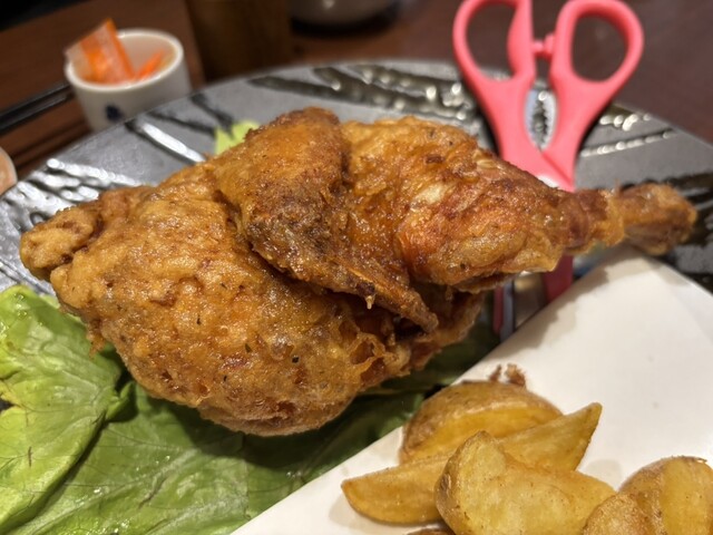 やみつき必至の鶏の半身揚げ。カットしてシェアも◎