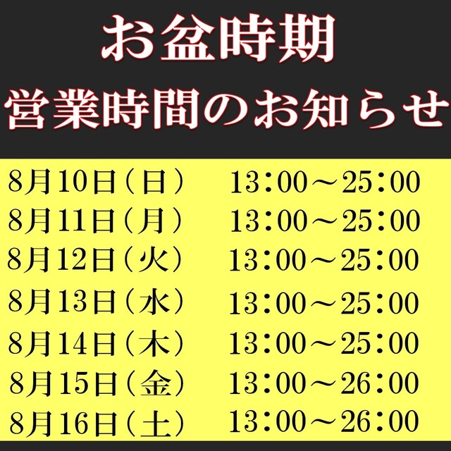 お盆期間、年末年始の営業時間は、公式ホームページもしくは店舗にお問い合わせください