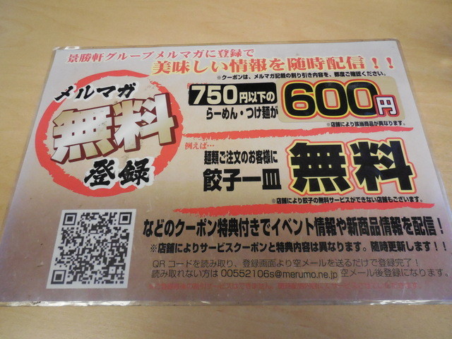 メルマガ登録で、750円以下のらーめん・つけ麺が600円に