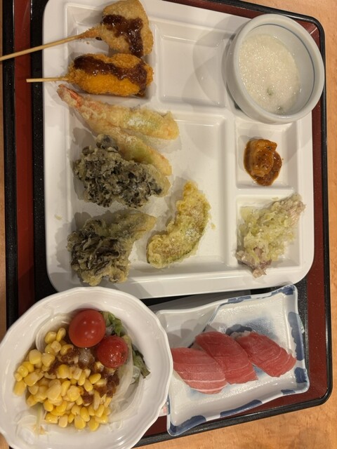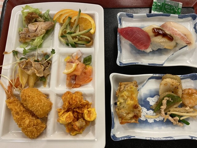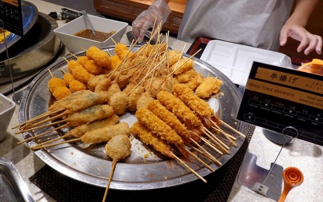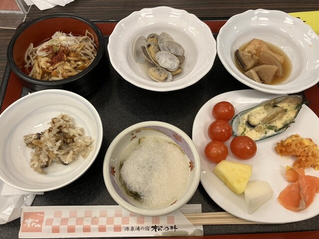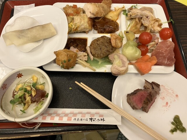 群馬県みなかみ町にある源泉湯の宿松野乃井店の夕食です。ライブキッチンのステーキや天ぷら、舞茸やら色々な和洋折衷料理やら、ドリンクバーめありで、炊き込みご飯もありで、どれも作りたてで美味しかったです。デ...