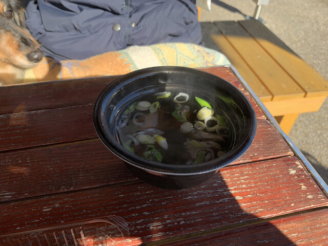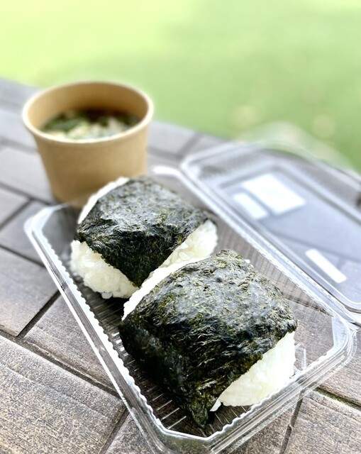 ワンコと一緒♪ 店先のベンチで♪ 美味しいおにぎりで朝ごはん♪