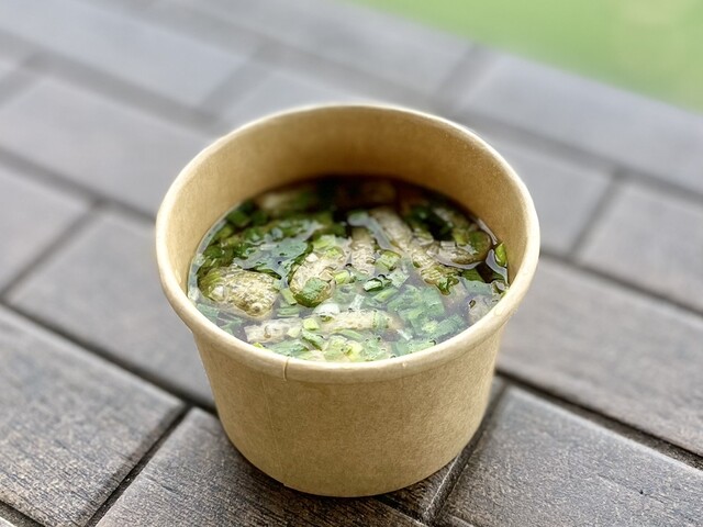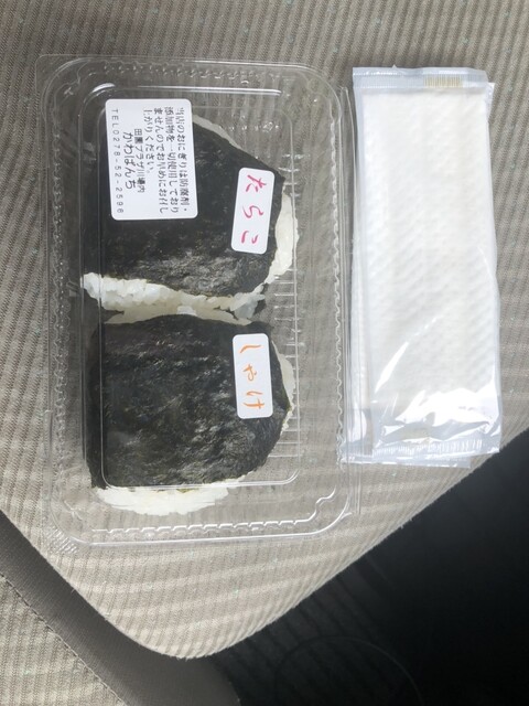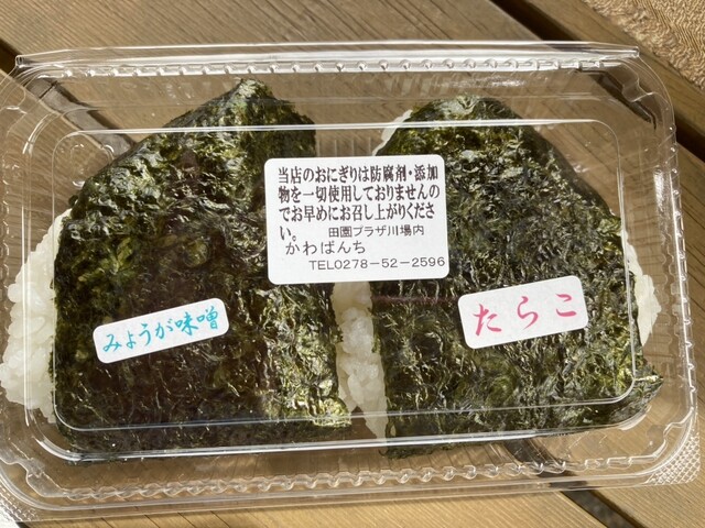 川場村の田園プラザの一角にある、おにぎり屋さんで有名な、かわばんち でおにぎり2個セットをたのみ、たらこと辛子高菜で一品を玉蒟蒻にしました。