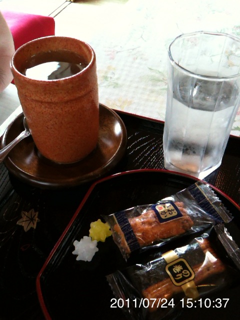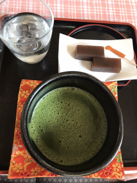 お抹茶を注文! 「お菓子を用意するので食べててください。その間に抹茶たててきます」とのことで羊羹が出てきました♪♪ 羊羹固めで甘さ控えめでめちゃくちゃ美味しい! 羊羹とお茶一... 詳細を見る