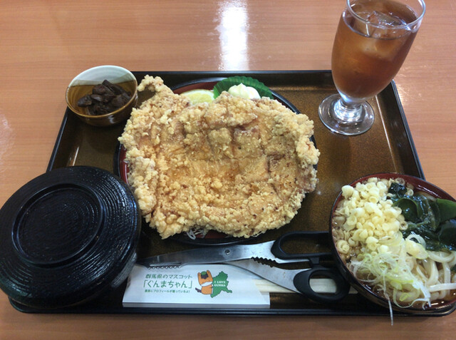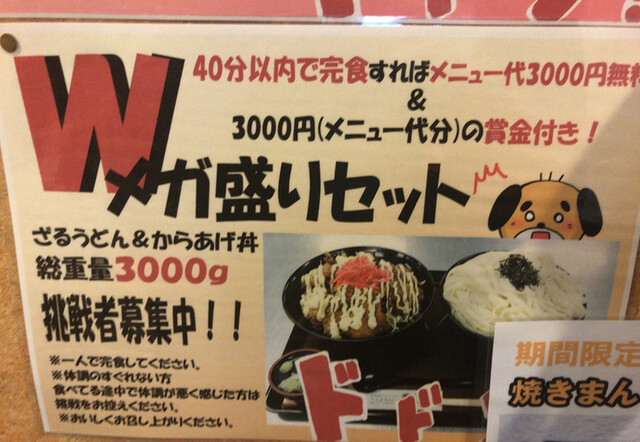 チャレンジメニュー・メガ盛りからあげ丼2000g・30分以内完食でタダ+2000円の賞金付き・Wメガ盛りセット(ざるうどん・から揚げ丼)3000g・40分以内完食でタダ+3000円の賞金付きの有る店