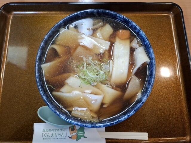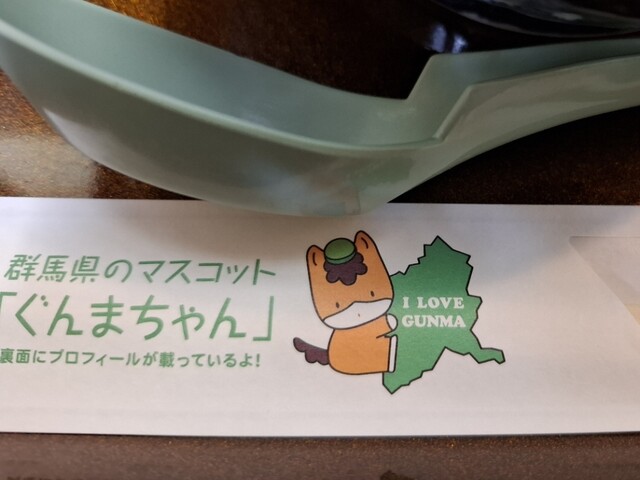 お土産ものと同時に上州名物がいただける庵古堂、日本三大うどんである水沢うどん、焼きまんじゅう等々に加え、おっきりこみもあり、こちらをいただきます。箸袋にはご当地ぐんまちゃん。