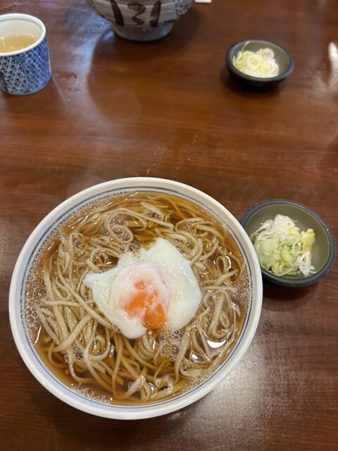 蕎麦の味を楽しみたいと思い、かけそばと温泉たまごをトッピングで注文。