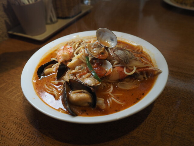 デミグラスのハンバーグが美味しい印象でしたが、今回は魚介類のパスタとポークジンジャーをオーダ。