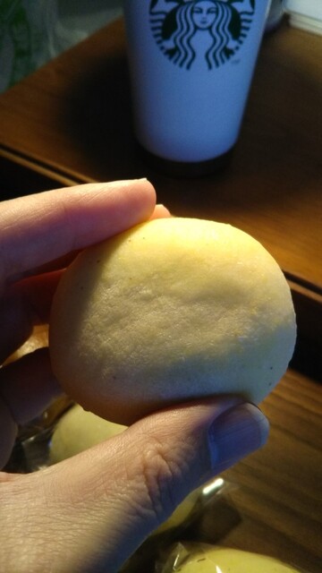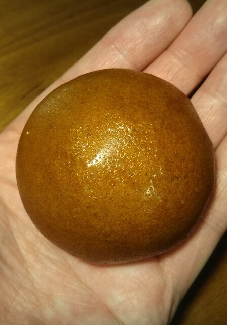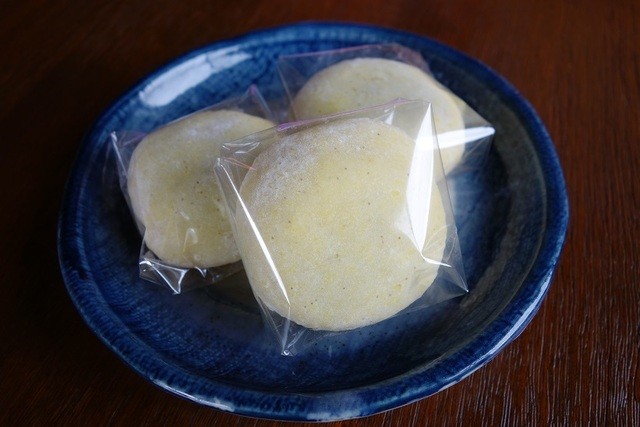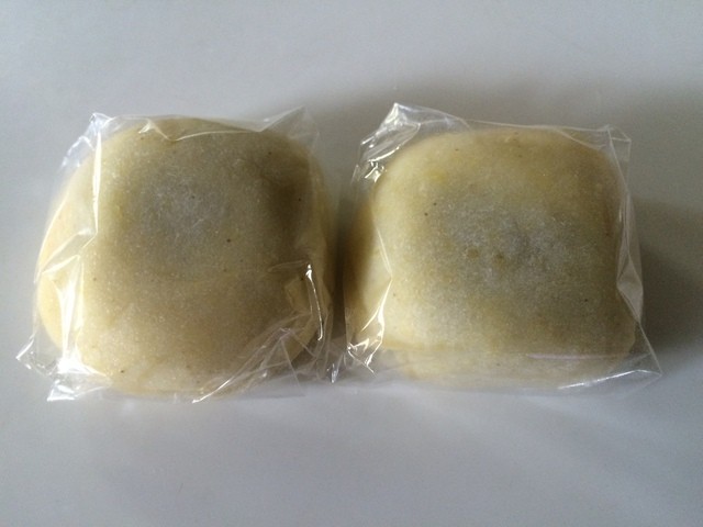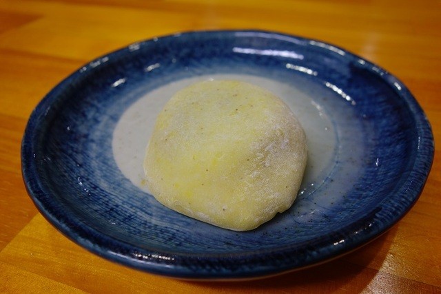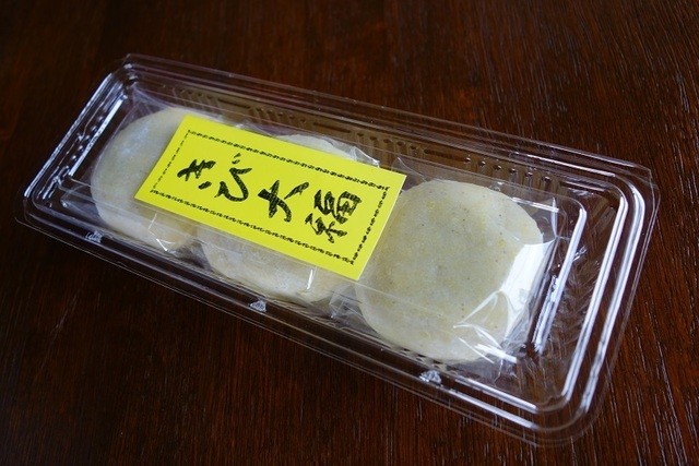 淡い黄色のキビ大福は手に持つとズッシリとした重みが有り楽しみです。