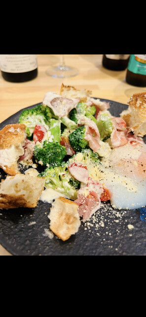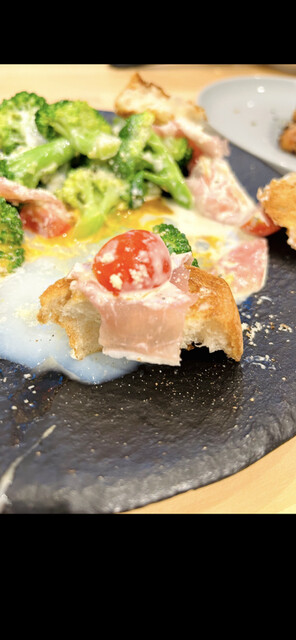 それぞれのパーツの食材、生ハムやトマト、バケットも美味しい それぞれの食材と温玉子とシーザードレッシングのマリアージュの仕方がとてもよく
