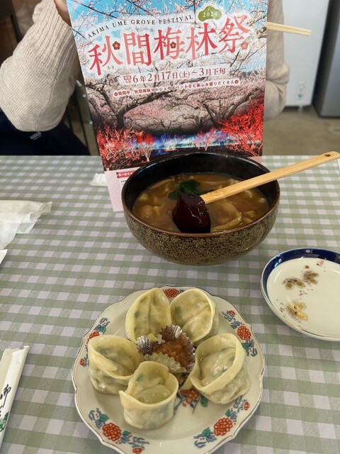 注文したのは温まりそうな梅うどんとおきりこみ、宇都宮市民として餃子をみたら食べておきたい花梅餃子。梅うどんは梅が...