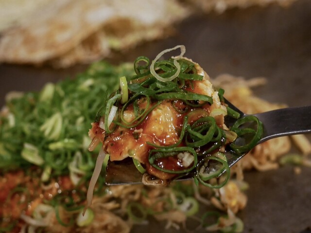 店内で目を引く巨大な鉄板は厚さ2cm。この鉄板の上でスタッフが熟練の技をもって焼き上げるお好み焼は、ベタつきのないさっぱり系。甘みを抑えたソースを使っているため、飲んだ後のシメでもさらりと食べられるほどだ。地元客はもちろん、この味を求めて県外から訪れる客も多い。お好み村の「ふみちゃん」の姉妹店としてもすっかりおなじみ。