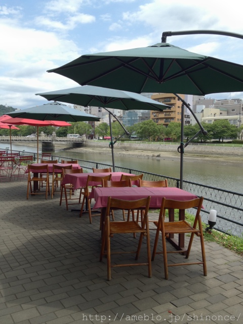 京橋川の水面がきらきら、水辺のオープンカフェ、牡蠣亭