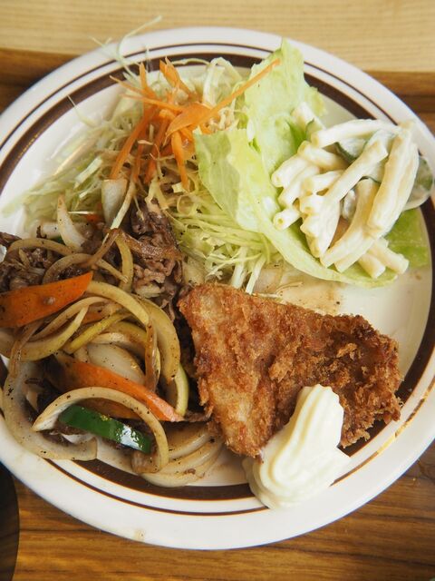「魚フライ、ササミカツ、焼き肉、ハンバーグ」から一品選ぶので一品定食らしく自分は魚フライにした。