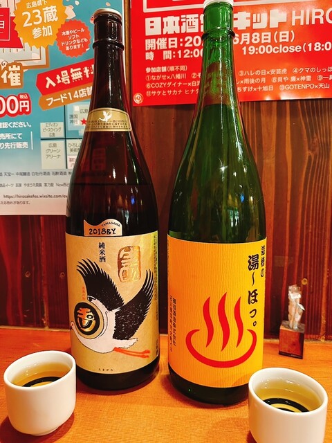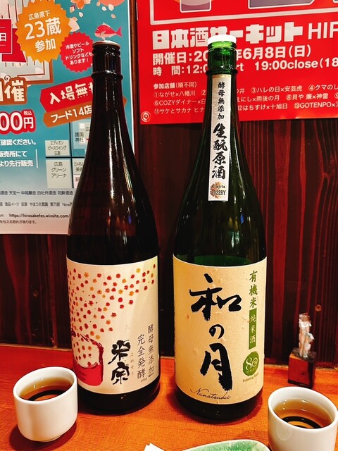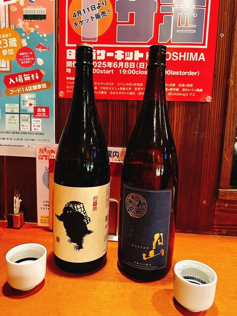 料理と日本酒の相性を愉しんで頂ければと思います。 日本酒はスッキリした味から、しっかりと熟成したお酒まで、 燗にすると味わいが増すお酒など、奥深く愉しむ事ができます。 地元広島のお酒を始め色々な地域のお酒を置いております。 こじんまりとした居酒屋ですので ゆっくりくつろいで頂...けます。 お一人様も大歓迎!