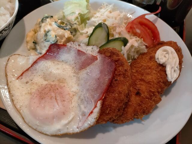 SOS定食は白身フライ・コロッケ・ハムエッグの内容。