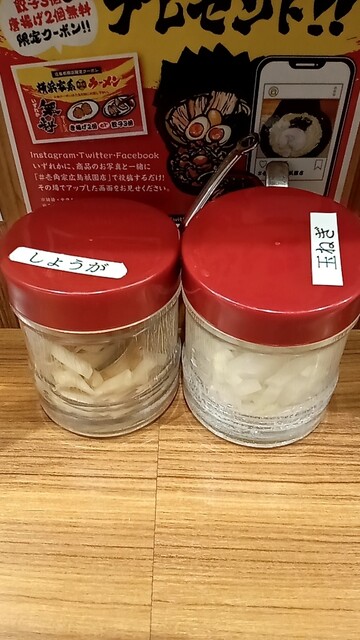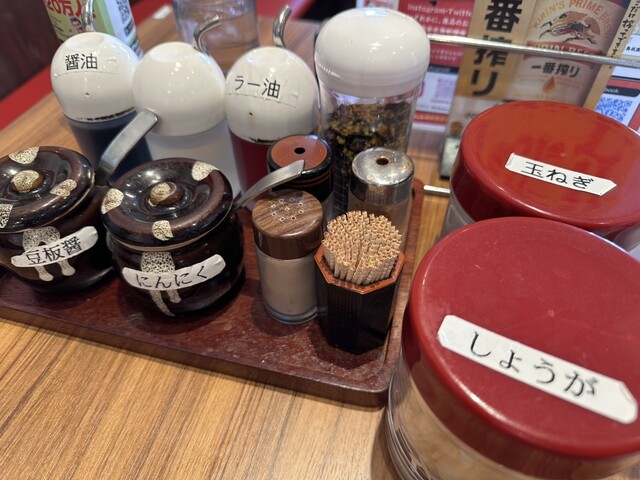 8分待ちで全揃い。待ってる間に卓上の薬味などをチェック。