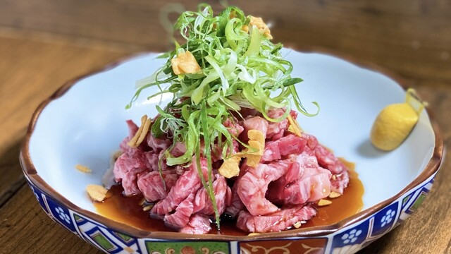 黒毛和牛ハラミと九条ねぎのユッケ (by お店)