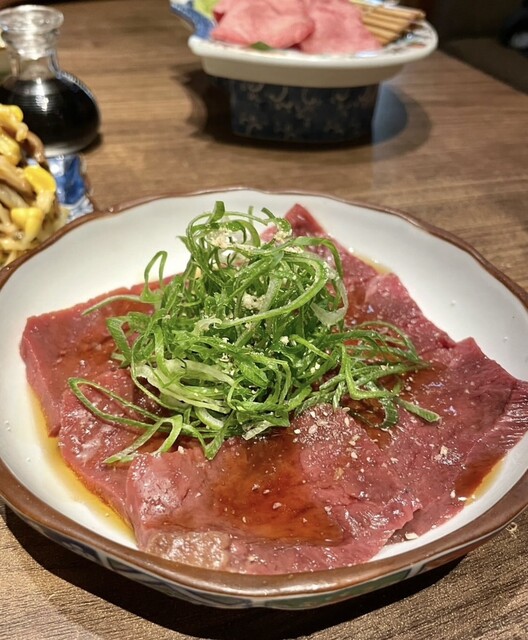 さらに感動したのは、レバーのように柔らかな赤身肉。こちらはタレにさっと潜らせ、ネギをたっぷりと乗せて頬張るのが流儀。口に入れた瞬間のふわっとした舌触りと、じんわりと広がるタレの甘さ、そして赤身のもつ野性味ある旨味が、まさに完璧なバランスでした。「生肉専門店」の看板に恥じない、鮮度と技術の両立を感じさせます。