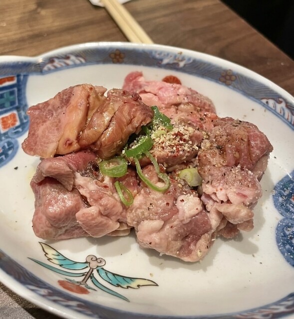 まず、供された皿を見て驚いたのは、その肉の厚みと艶。ご覧いただきたい、艶めくロースの塊が無造作に盛られた一皿。これはただの肉ではない。赤身と脂が織りなすマーブル模様はまるで絵画のようであり、細かな霜降りの一筋一筋がまさに“肉の設計図”とも呼ぶべき精緻さを誇ります。ネギと塩胡椒であえてシンプルに味付けされたその佇まいは、肉の本質で勝負している証。焼く前から「これは絶対にうまい」と確信してしまうオーラが漂っていました。