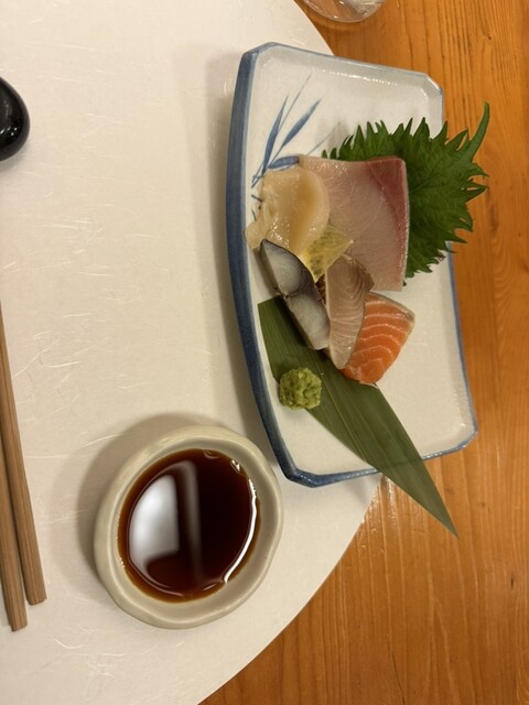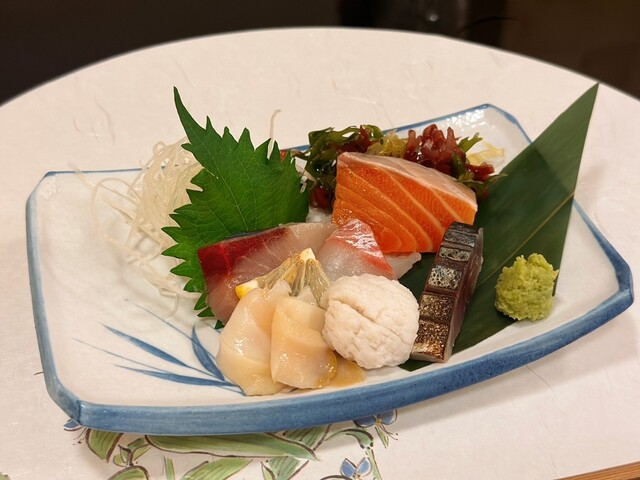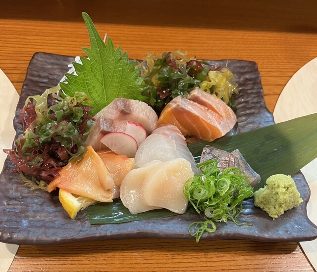 続いてはお造りの盛り合わせ。ハマチ、サーモン、つぶ貝、鯛、炙りシメサバのラインナップで、新鮮な魚介類を引き立てる醤油が絶品。少し甘味が強くとろっ...