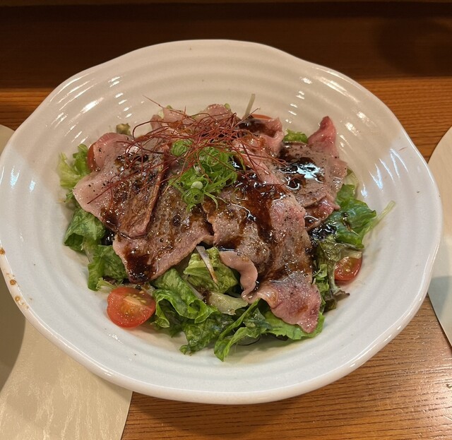 会食利用で訪問。予約して伺い、店中にある小上がりの座敷席に案内いただく。飲み放題付きのコースのスタートをお願いすると、生ビールとともに一品目の炙りチャーシューのサラダが到着。香ばしくパリッとした食感の...