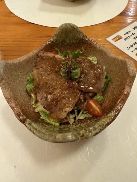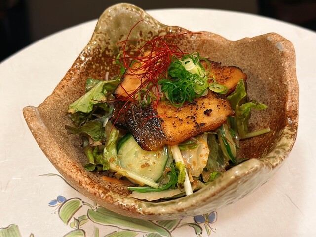 会食利用で訪問。予約して伺い、店中にある小上がりの座敷席に案内いただく。飲み放題付きのコースのスタートをお願いすると、生ビールとともに一品目の炙りチャーシューのサラダが到着。香ばしくパリッとした食感のチャーシューとサラダのドレッシングの調和がいい感じ。