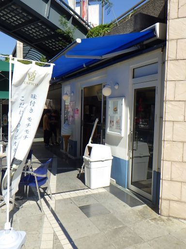 外観は基町クレドの地下1階のテラスにあるプレハブ店舗で、白壁に青い防水布の巻き取り式庇、緑色のパラソル、リゾートのテイクアウトのデザー...